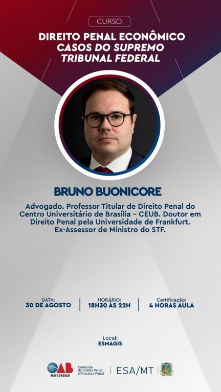 A Escola Superior da Magistratura de Mato Grosso está oferecendo vagas para a palestra ‘Direito Penal Econômico Casos do Supremo Tribunal Federal’, nesta sexta-feira (30