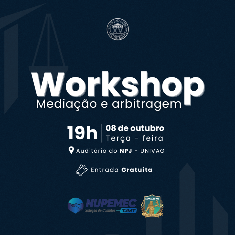 O Poder Judiciário de Mato Grosso participa nesta terça-feira (8 de outubro), das 19h às 22h, do Workshop a Mediação e a Arbitragem na Prática,