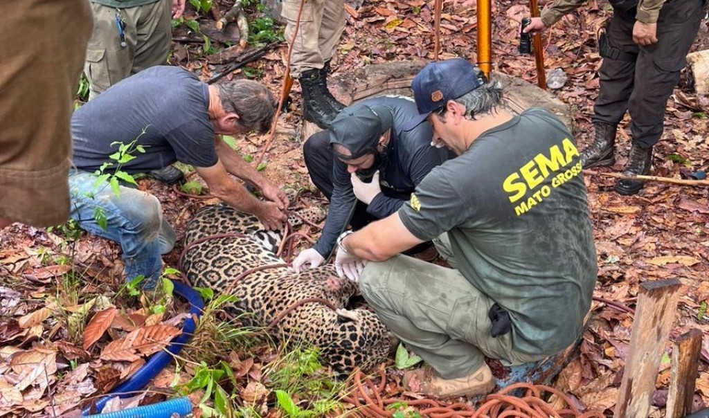 O Corpo de Bombeiros Militar de Mato Grosso e a Secretaria de Estado de Meio Ambiente (Sema) resgataram uma onça-pintada macho, adulto, na tarde desta