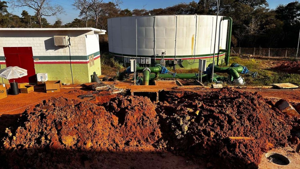 Substituição da curva rompida na adutora 400mm está sendo feita com duas curvas 45° injetada e luvas pelo sistema em eletrofusão O Departamento de Água