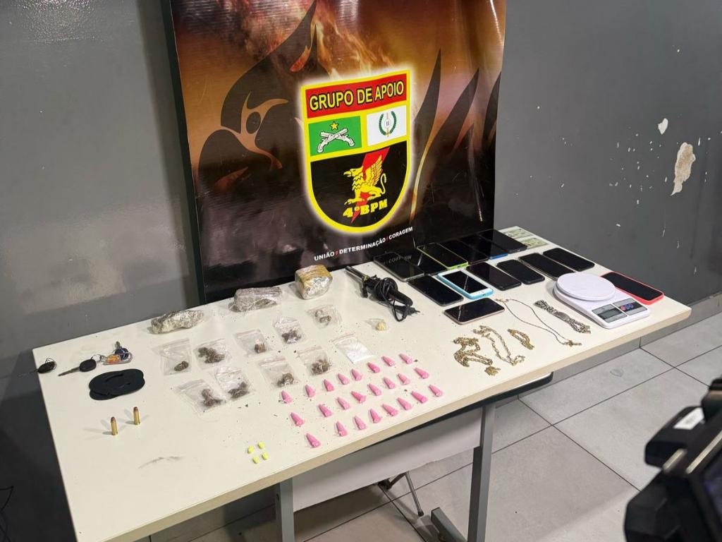 Policiais militares do Grupo de Apoio (GAP) do 4º Batalhão prenderam quatro homens e uma mulher pelos crimes de roubo e tráfico de drogas, na