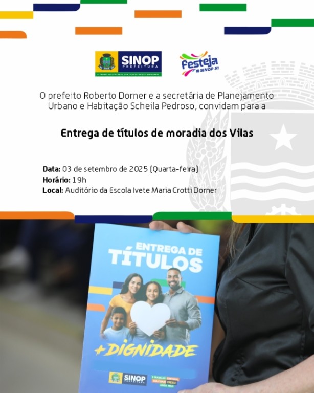 Nesta quarta-feira, três de setembro, às 19h, a Prefeitura de Sinop realiza na Escola Municipal de Educação Básica de Tempo Integral Ivete Maria Crotti Dorner, a entrega de 130 escrituras gratuitas, aos