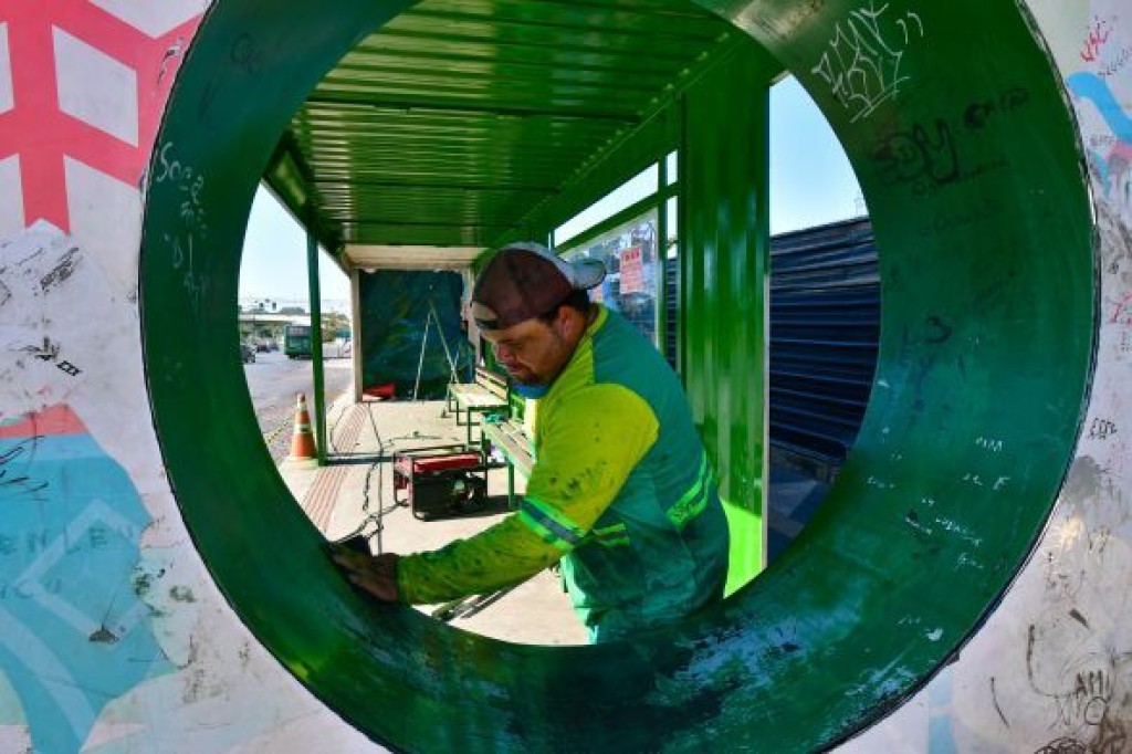 A Empresa Cuiabana de Zeladoria e Serviços Urbanos (Limpurb) está realizando o trabalho de manutenção no abrigo de passageiros instalado em frente ao Pantanal Shopping, na Avenida Historiador Rubens de Mendonça (Av. do CPA). A estrutura foi construída pela gestão Emanuel Pinheiro tendo como base o reaproveitamento de contêineres.