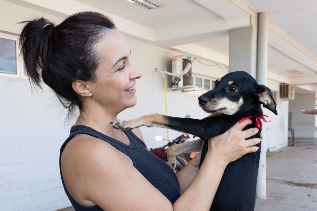 A imagem mostra uma mulher, de cabelos negros e blusa preta, segurando um cão filhote no colo, de cor preta e marrom. Ela sorri e olha para o animal na altura do rosto.
