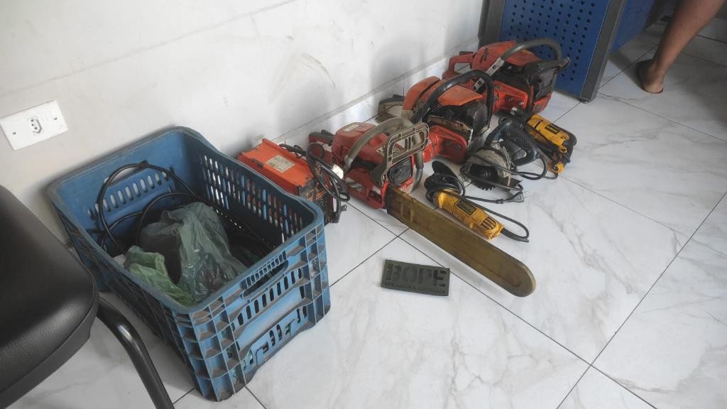 Na abordagem, os homens foram questionados sobre o furto e confessaram terem cometido o crime. Em seguida, a dupla levou os policiais até o local onde os produtos furtados estavam escondidos, sendo quatro motosserras, uma lixadeira e furadeira.