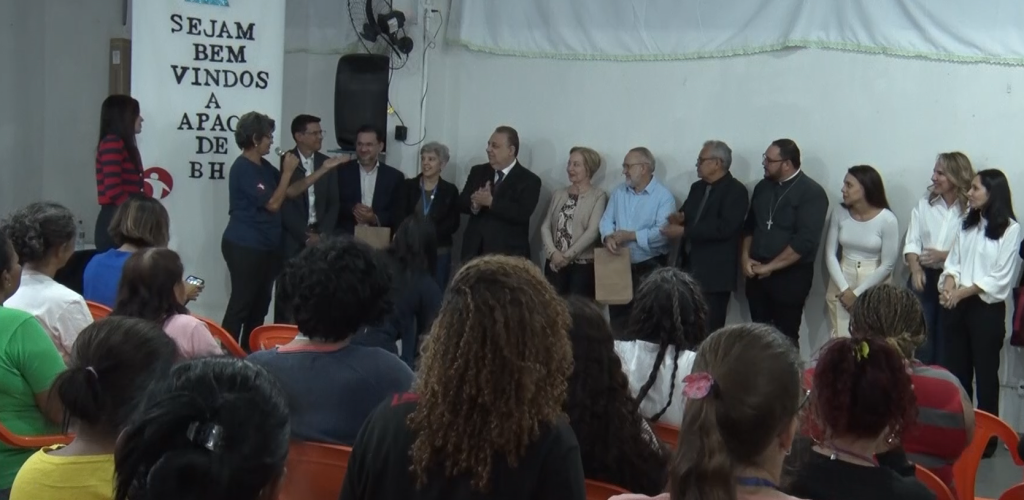 #Paratodosverem. Esta matéria possui recursos de texto alternativo para promover a inclusão das pessoas com deficiência visual. Foto 1: Foto em plano aberto que mostra várias mulheres, recuperandas da APAC feminina, sentadas de costas para a foto e de frente para as autoridades de Mato Grosso e de Minas Gerais, que fizeram a visita à unidade. No lado esquerdo da foto, há um grande mural onde se lê: ‘Sejam bem-vindos à APAC de BH’. Foto 2: Da esquerda para a direita, em pé: juíza Viviane Brito Rebello; desembargador do TJMG, José Luiz de Moura Faleiros falando ao microfone; desembargadora Clarice Claudino da Silva e o desembargador Jorge Luiz Tadeu Rodrigues.
