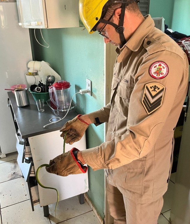 Já por volta das 9h10, a equipe da 11ª CIBM recebeu outro chamado, dessa vez para realizar a captura de uma serpente no bairro Santa Rosa. No local, a equipe constatou que a serpente, de cor verde, estava embaixo de um guarda-roupas, dentro de uma residência.