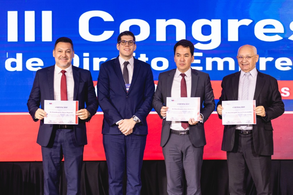 Esta matéria possui recursos de texto alternativo para promover a inclusão das pessoas com deficiência visual. Imagem 1: foto horizontal colorida dos desembargadores Marcos Regenold, Hélio Nishiyama e Juvenal Pereira exibindo o certificado de participação no congresso, com uma tela ao fundo com o nome do evento nas cores azul e vermelho. Eles estão em pé e posam para a foto.