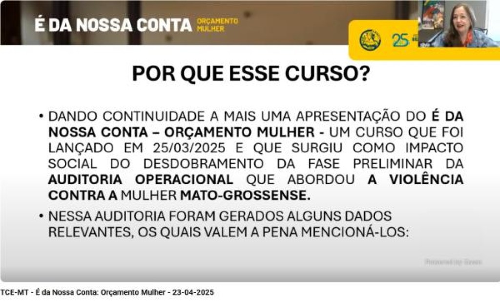 “Apesar de termos leis de proteção à mulher, o feminicídio continua. Ouvimos todos os dias notícias de assassinatos ou outros tipos de violência contra a mulher. Então, esse curso que o Tribunal está realizando nasceu dessa necessidade de os órgãos e a sociedade saberem um pouco mais sobre orçamento, ferramentas de controle, onde buscar recursos, como chegar até o prefeito ou secretários para ter mais investimento e ajuda para as mulheres”, ressalta a auditora.