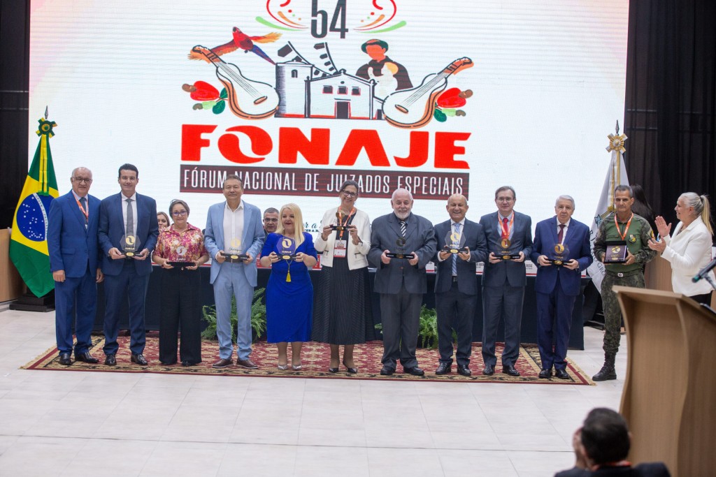 A 54ª edição do Fórum Nacional dos Juizados Especiais (Fonaje), que está sendo realizada na sede do Tribunal de Justiça de Mato Grosso (TJMT) até sexta-feira (29 de novembro), homenageou juízes e desembargadores, além de um policial militar, por suas contribuições, ao longo de suas carreiras, aos Juizados Especiais. O evento é realizado pelo Poder Judiciário Estadual, por meio do Conselho de Supervisão dos Juizados Especiais e da Escola Superior da Magistratura de Mato Grosso (Esmagis-MT).Aos magistrados do TJMT, o reconhecimento foi conferido por sua dedicação profissional ao longo de suas carreiras aos Juizados Especiais do Estado, para que pudessem ter uma sede ampla, com estrutura confortável, que além de valorizar os servidores e magistrados do Estado, entrega o melhor atendimento à população.