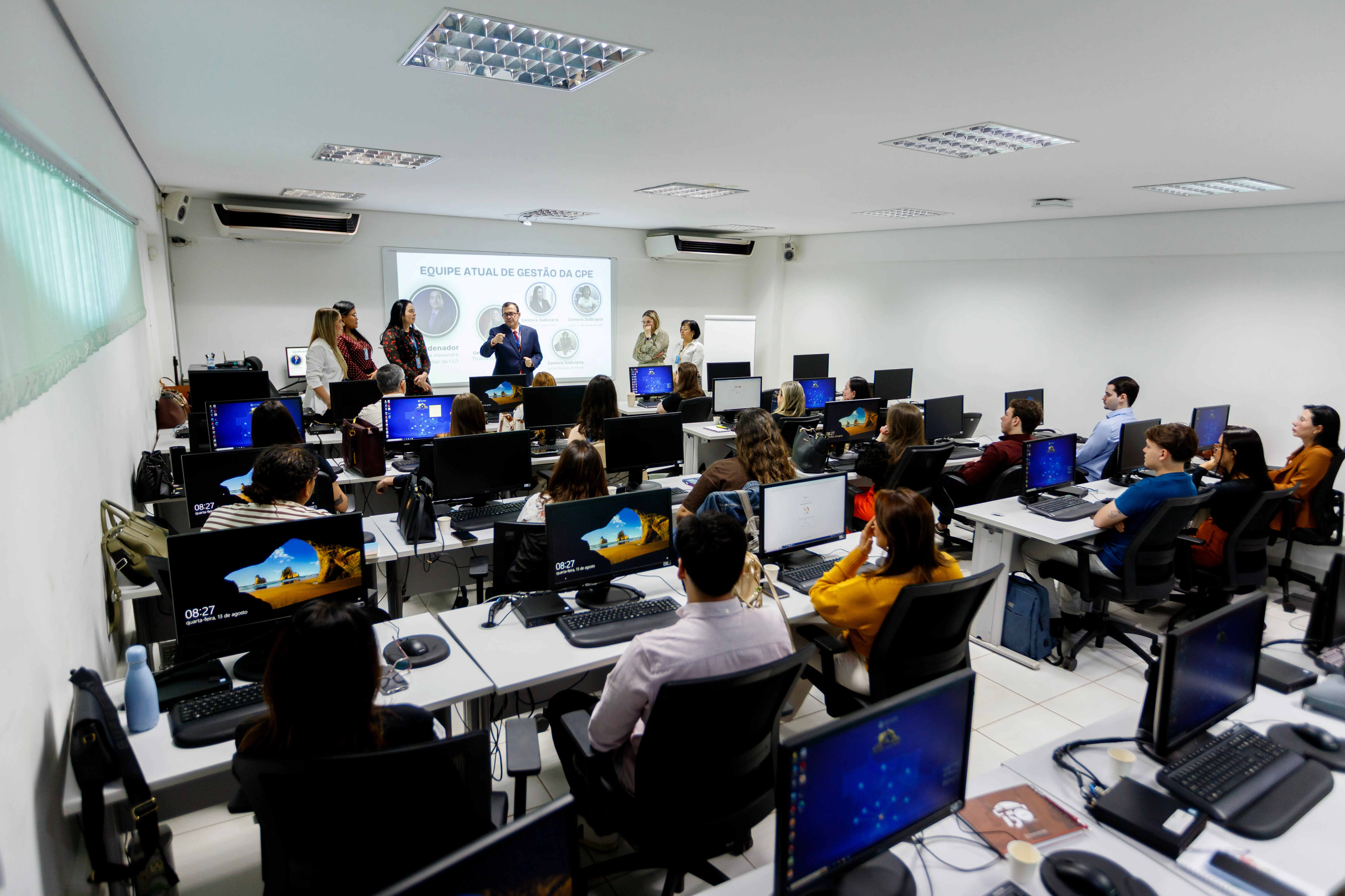 Sala de aula com computadores e telão exibe equipe de gestão da CPE; homem de terno fala ao público enquanto seis pessoas estão alinhadas à frente.CPE – A CPE foi criada pela Lei Estadual n. 11.126/2020 para apoiar diretamente os trabalhos judiciais, direcionando mão de obra de forma dinâmica nas unidades de Primeiro Grau. Com pouco tempo de funcionamento, consolidou-se como uma ferramenta estratégica, e hoje tem como as principais frentes de atuação: apoio a 105 unidades na expedição de Requisição de Pequeno Valor (RPVs) e precatórios, o suporte ao Núcleo de Justiça 4.0 – Núcleo de Execução Fiscal e o atendimento a 50 unidades cíveis e criminais.