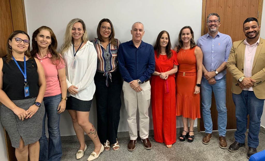 Esta matéria possui recursos de texto alternativo para promover a inclusão das pessoas com deficiência visual. Descrição de imagem: foto horizontal colorida da equipe reunida, sendo seis mulheres e três homens. Todos estão em pé, alguns com as mãos cruzadas na frente do corpo, em uma sala com parede branca e porta de madeira.