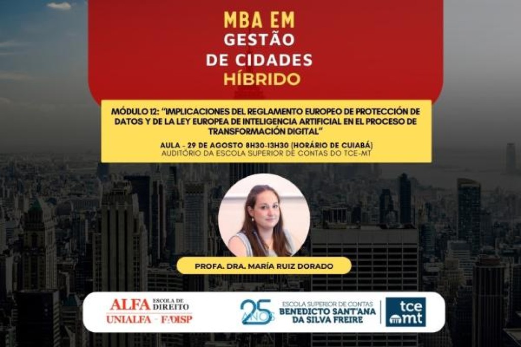 O 12º módulo do MBA em Gestão de Cidades do Tribunal de Contas de Mato Grosso (TCE-MT), que será realizado a partir das 8h30 desta sexta-feira (29), no auditório da Escola Superior de Contas, contará com a presença internacional da professora María Ruiz Dorado, da Universidad de Castilla, na Espanha. A aula terá como tema “Implicaciones del Reglamento Europeo de Protección de Datos y de la Ley Europea de Inteligencia Artificial en el Proceso de Transformación Digital”.