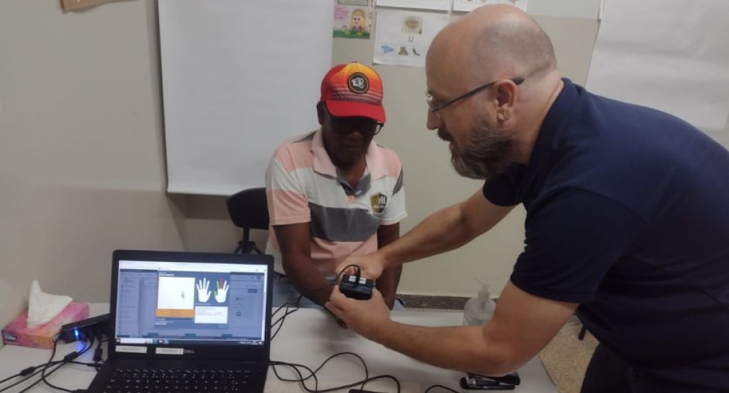 #PraTodosVerem: A imagem principal mostra um homem sendo atendido em um mutirão da Justiça Eleitoral. Ele está sentado enquanto um servidor coleta suas digitais em um equipamento biométrico conectado a um computador. Ao final do texto, tem uma galeria com mais fotos dos mutirões.