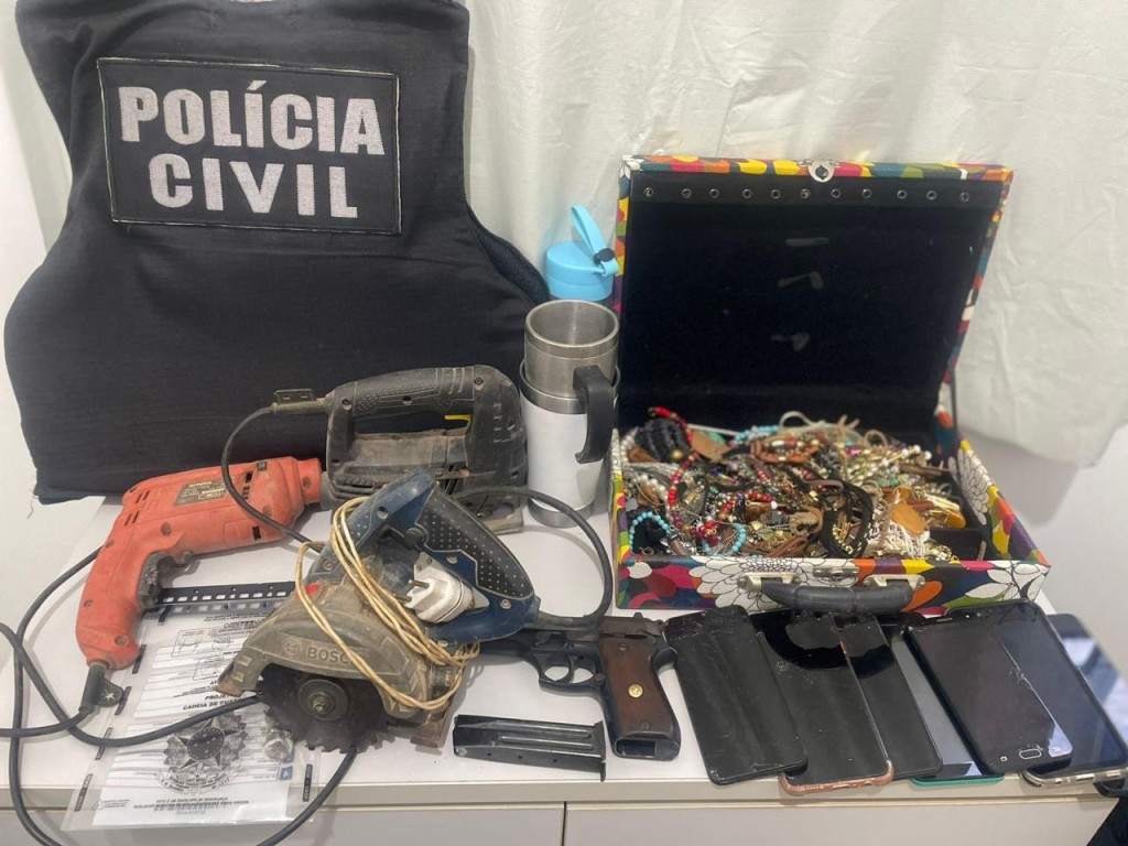 No local foi apreendida uma arma de fogo, além de porção de maconha, roupas, utensílios domésticos, perfumes, ferramentas, eletrônicos, joias, entre outros objetos.