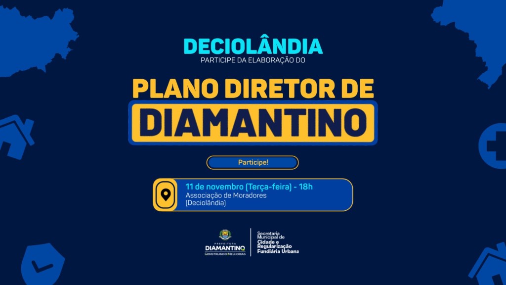 A Prefeitura de Diamantino, por meio da Secretaria Municipal de Cidades e Regularização Fundiária Urbana em parceria com a Fundação Getúlio Vargas convida os moradores de Deciolândia e região para participarem da reunião de apresentação e elaboração do Plano Diretor, que será realizada no dia 11 de novembro, às 18h, na Associação de Moradores de Deciolândia.