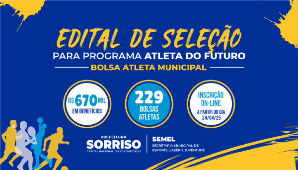 A Prefeitura de Sorriso, por meio da Secretaria Municipal de Esporte e Lazer (SEMEL), tem uma excelente notícia para os estudantes/atletas. Está aberto o edital de Chamamento Público n.° 001/2025 do “Programa Atletas do Futuro – Bolsa Atleta”, que vai conceder apoio financeiro para incentivar o desenvolvimento esportivo no Município.