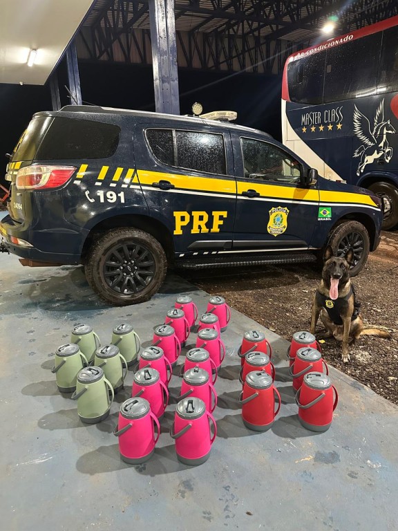 Durante fiscalização a um ônibus que fazia a linha Cuiabá (MT) x São José do Rio Preto (SP), um cão de faro indicou a presença de entorpecentes no compartimento de bagagens, em quatro caixas despachadas como encomendas. Ao abrirem os volumes, os policiais encontraram 24 garrafas térmicas que, após desmontagem, revelaram drogas ocultas nas espumas de isolamento.