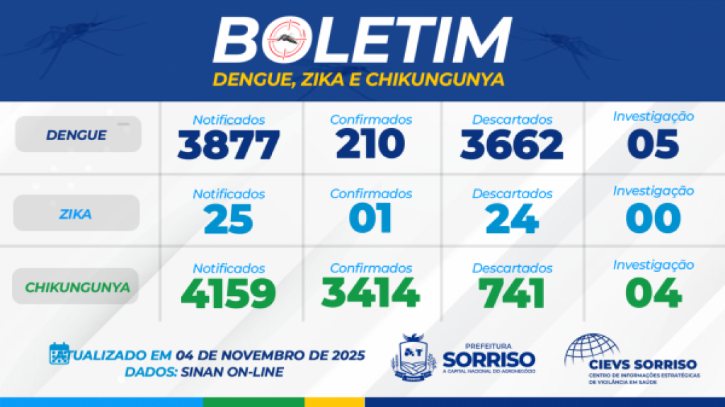 Hoje os bairros com maior número de registros de chikungunya estão o Vila Bela com 259; Rota do Sol com 216 casos; São José I com 160; Nova Aliança I com 151 registros; Jardim Amazônia com 146 e Novos Campos com 137 situações positivas. O antigo distrito de Boa Esperança e atual município vizinho de Boa Esperança contabilizou 377 registros – vale lembrar que no Ministério da Saúde, Boa Esperança ainda consta veiculado à Sorriso. Já em relação à dengue são 16 casos no Rota e 13 no Jardim Amazônia. O caso de zika foi registrado no bairro União.