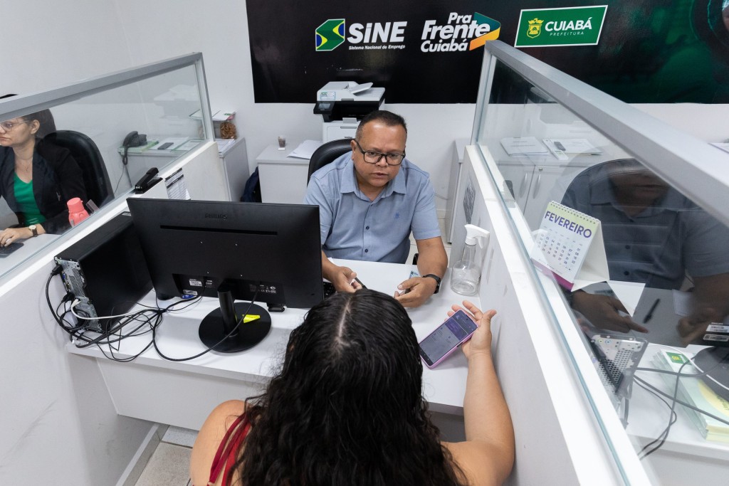 A imagem mostra um box de atendimento no Sine Municipal. Em primeiro plano servidor orienta uma pessoa. As marcas do Sine e da Prefeitura de Cuiabá são vistas num painel ao fundo.