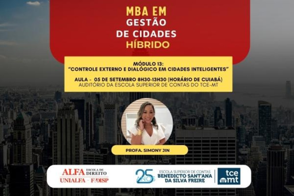O Tribunal de Contas de Mato Grosso (TCE-MT) realiza o 13º módulo do MBA em Gestão de Cidades, a partir das 8h30 desta sexta-feira (5), no auditório da Escola Superior de Contas. A aula será transmitida ao vivo pelo Canal do TCE-MT no YouTube e pela TV Contas (Canal 30.2).