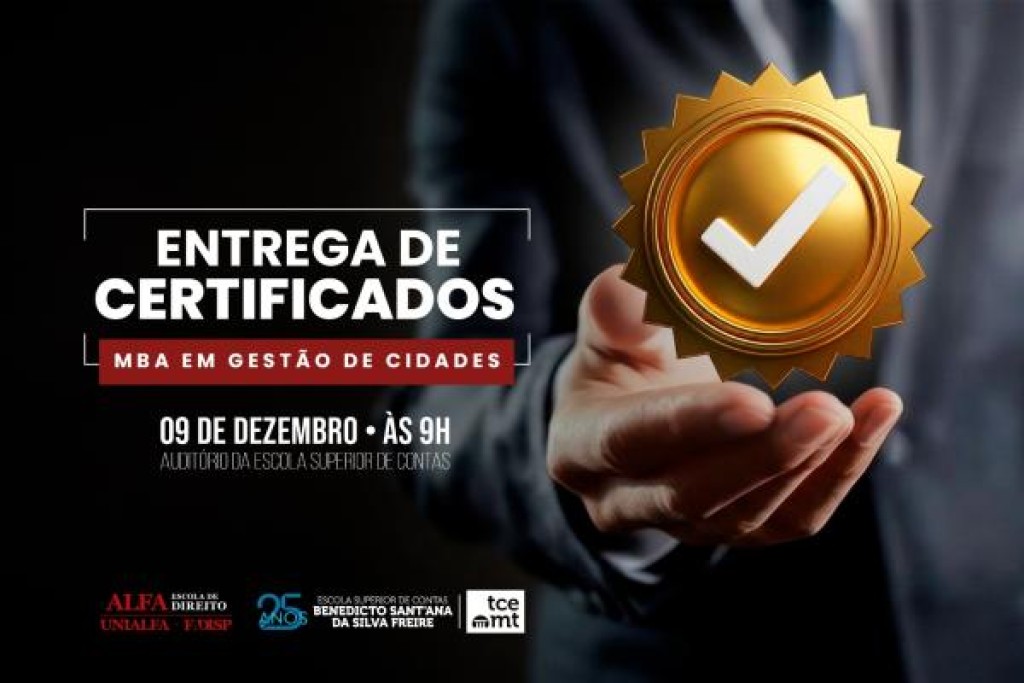 O Tribunal de Contas de Mato Grosso (TCE-MT) promove, a partir das 9h da próxima terça-feira (9), a solenidade de entrega dos certificados do MBA em Gestão de Cidades. O evento será realizado no auditório da Escola Superior de Contas e reunirá conselheiros, membros do Ministério Público de Contas, autoridades convidadas e os 375 alunos que concluíram o curso conforme os critérios definidos pela coordenação acadêmica.