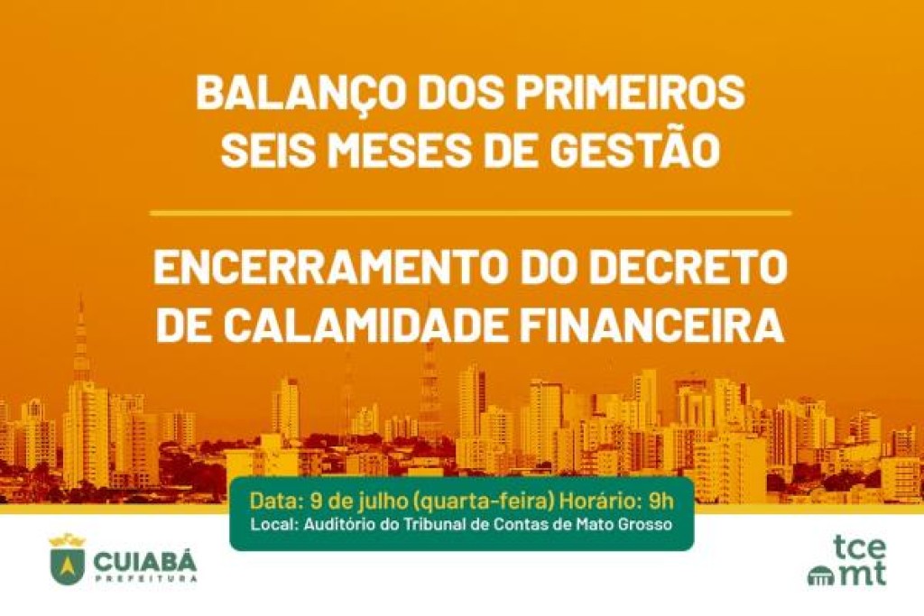 O Tribunal de Contas de Mato Grosso (TCE-MT) recebe, na quarta-feira (9), o balanço dos seis primeiros meses da atual gestão da Prefeitura de Cuiabá. A apresentação dos dados, referentes ao Decreto de Calamidade Financeira, será realizada no auditório da Escola Superior de Contas a partir das 8h30, com a presença de autoridades estaduais e municipais.