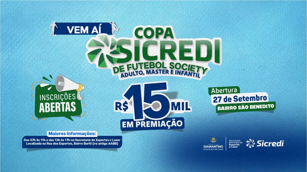 A Prefeitura de Diamantino, por meio da Secretaria Municipal de Esportes e Lazer, em parceria com a Cooperativa Sicredi Ouro Verde MT, realizarão no mês de setembro a Copa Sicredi de Futebol Society.